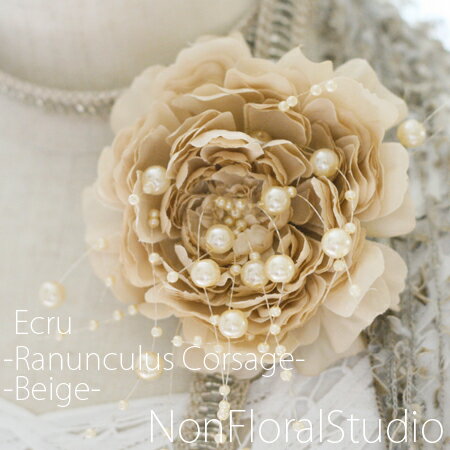 バラ、ガーベラなどのコサージュがよく見かけますので、ここは、ラナンキュラスのコサージュで